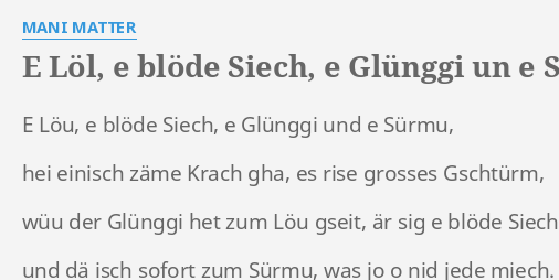 # тексты песен m mani matter. 0 beliebteste songtexte von mani matter. Kunscht isch geng es risiko (2012). I love lehrer's songs, but imo matter's lyrics even surpasses them in wit and poetical talent. November 1972 in kilchberg zh;